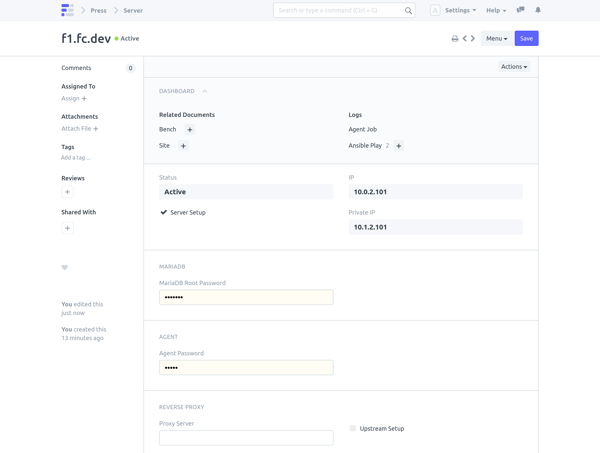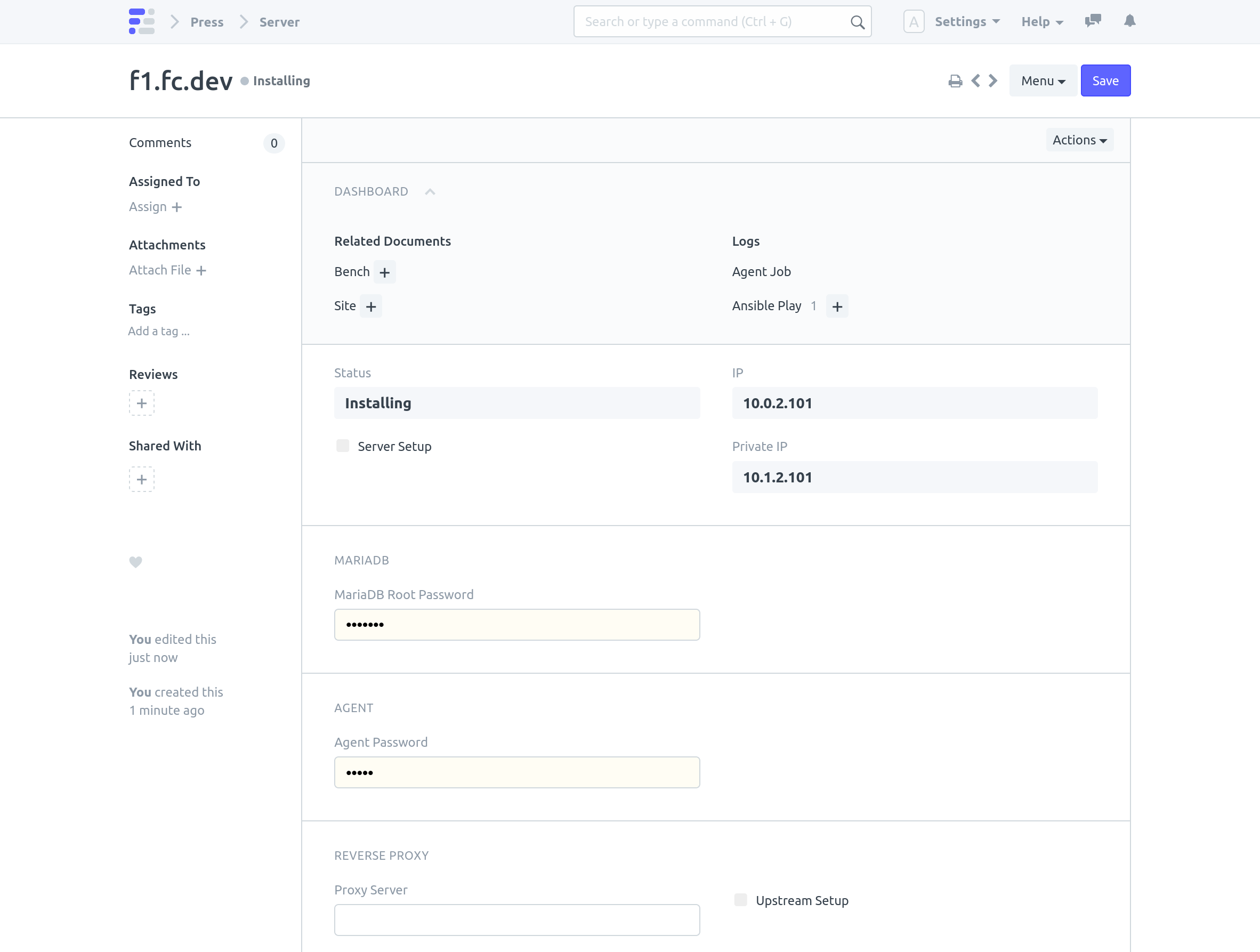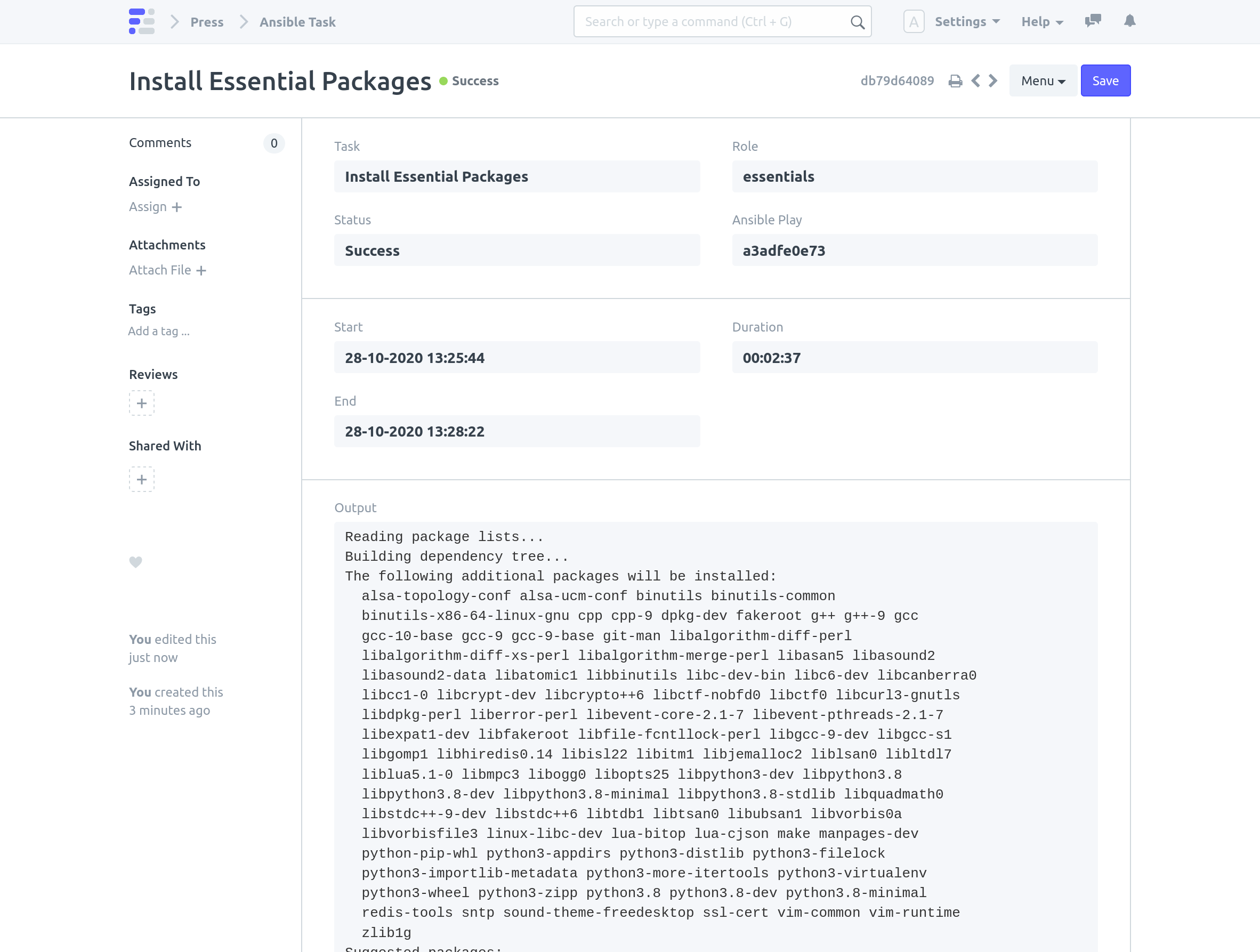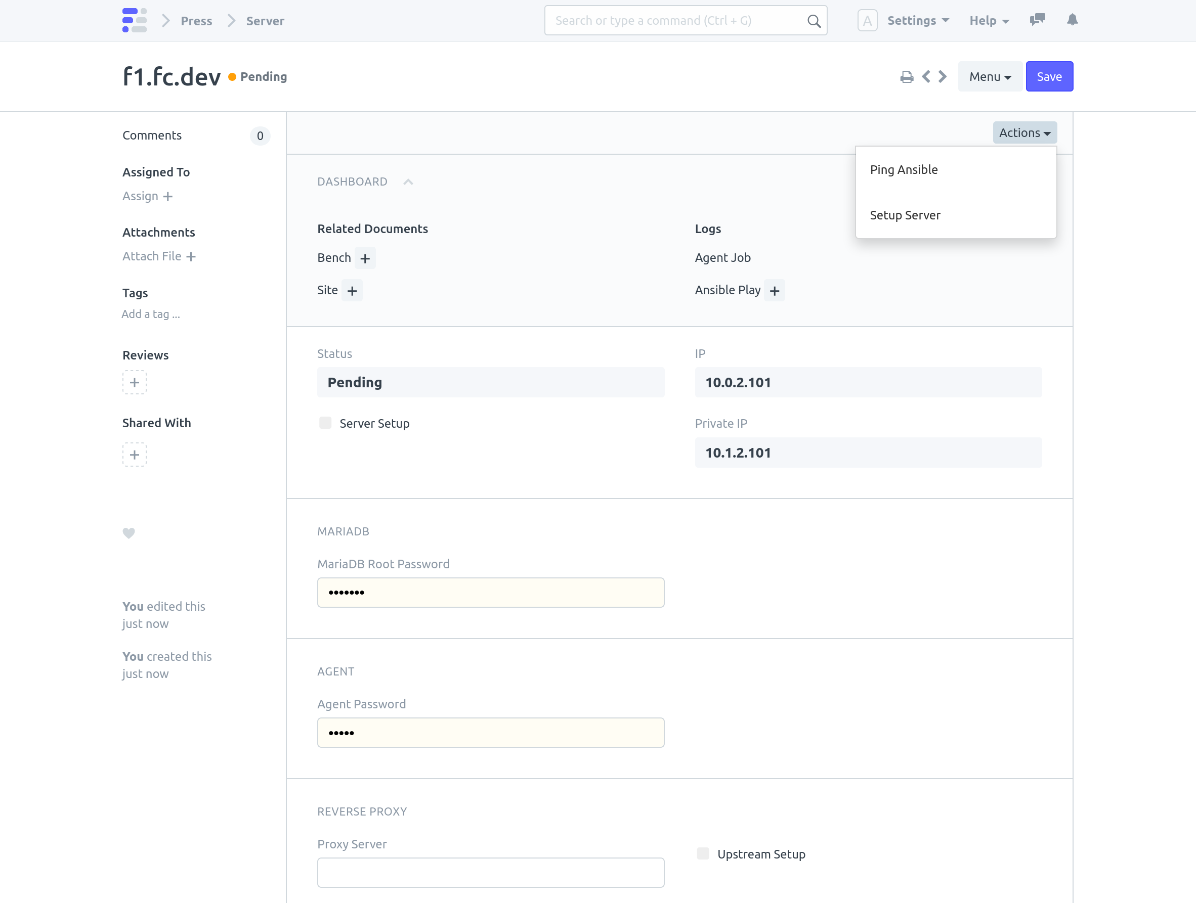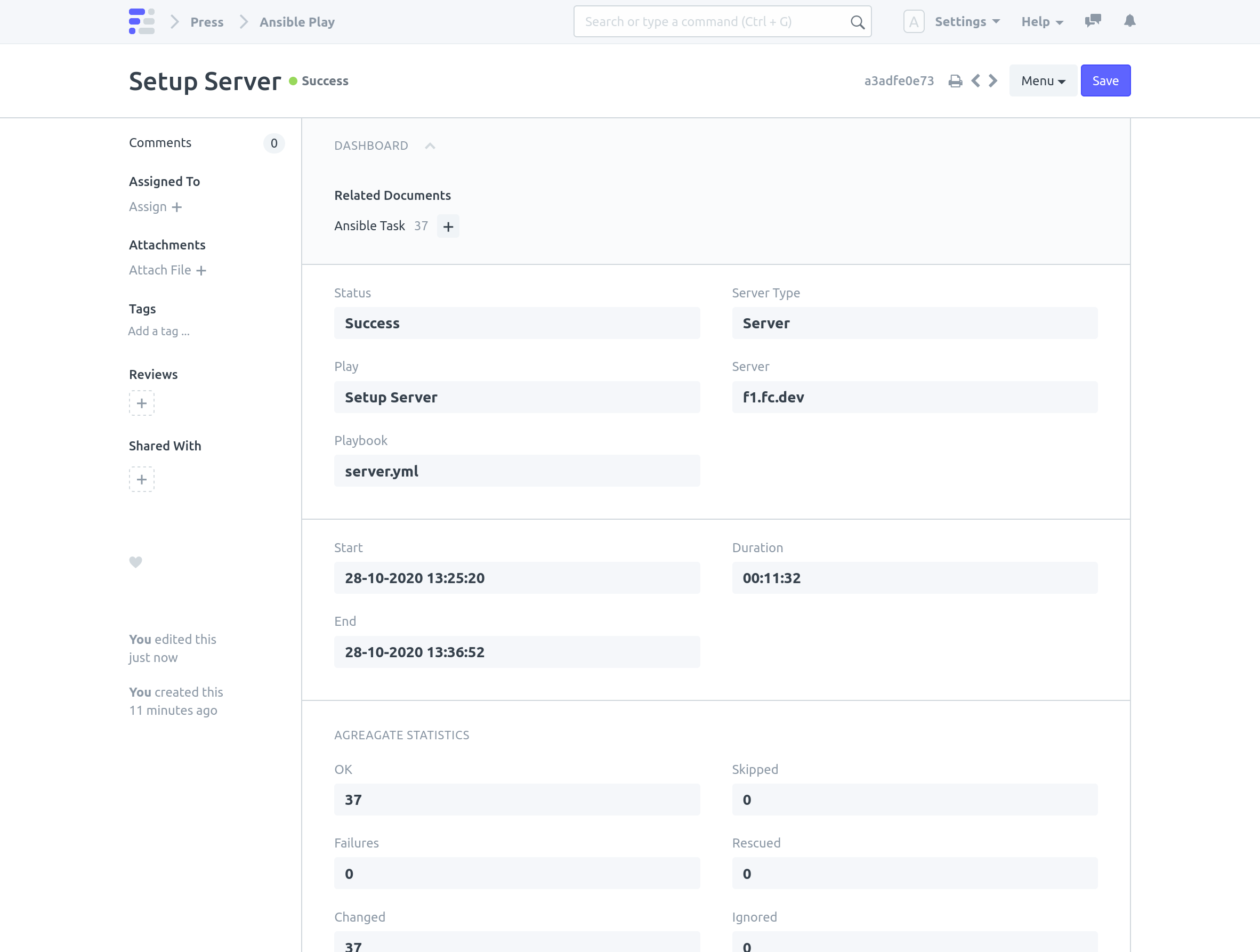 Setup Server action runs an Ansible playbook. The status of the play is tracked in Ansible Play and the tasks in the play are tracked in Ansible Task. play and task updates are reflected in realtime.