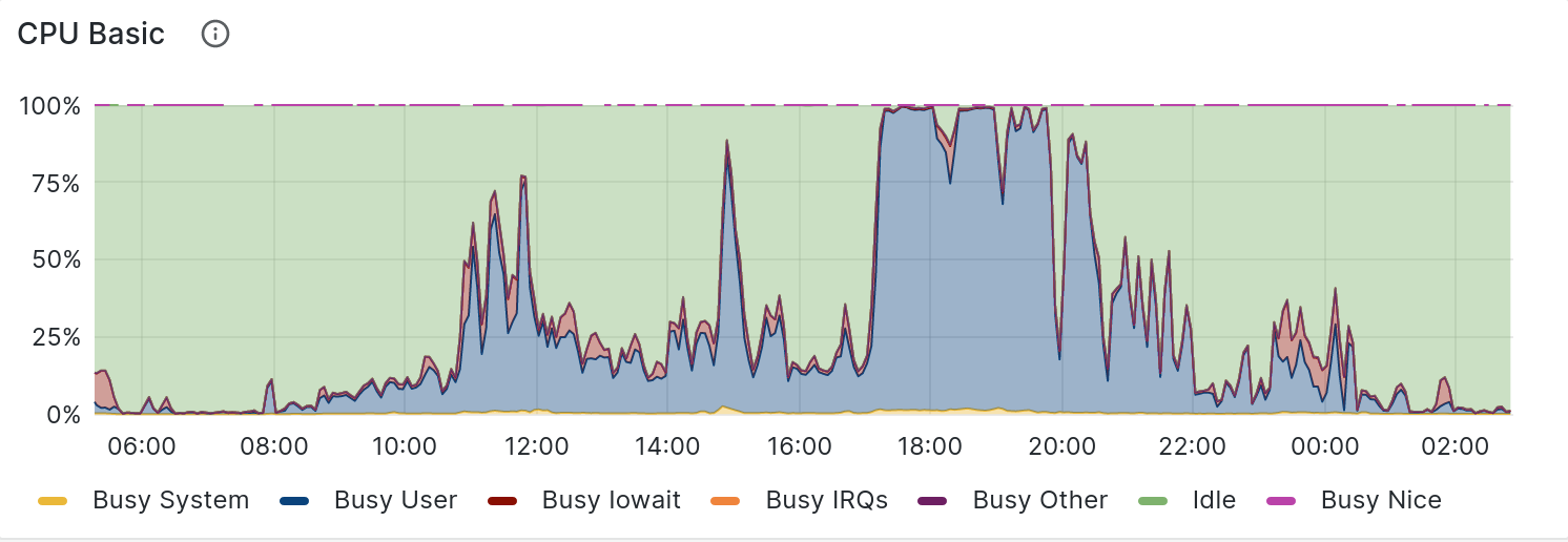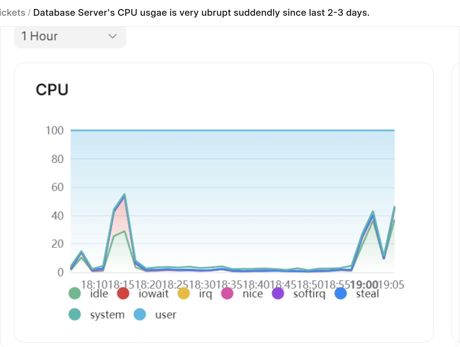 A red CPU graph on the other hand would indicate long time spent doing reading from disk. This is usually a sign that the DB server needs to be upgraded for more Memory/RAM
