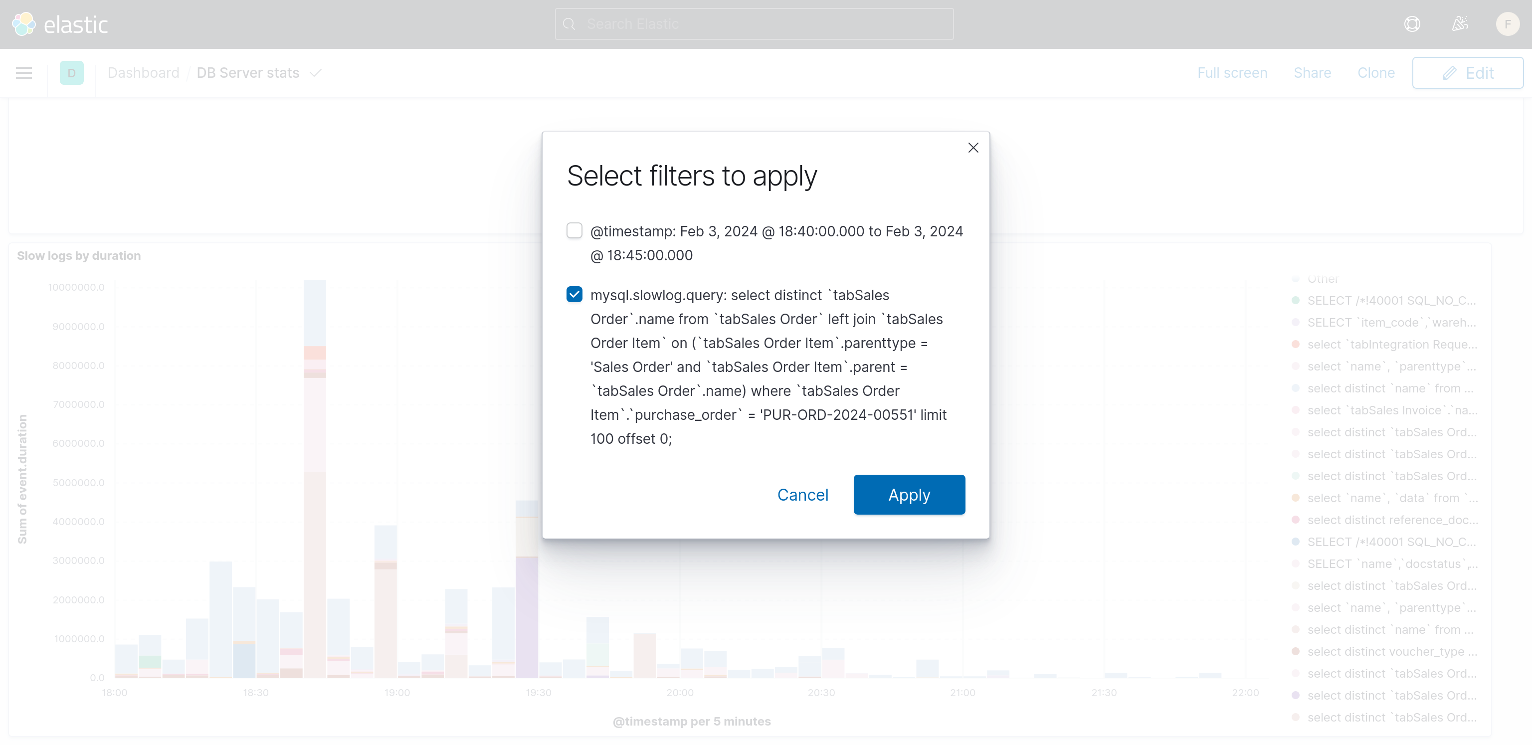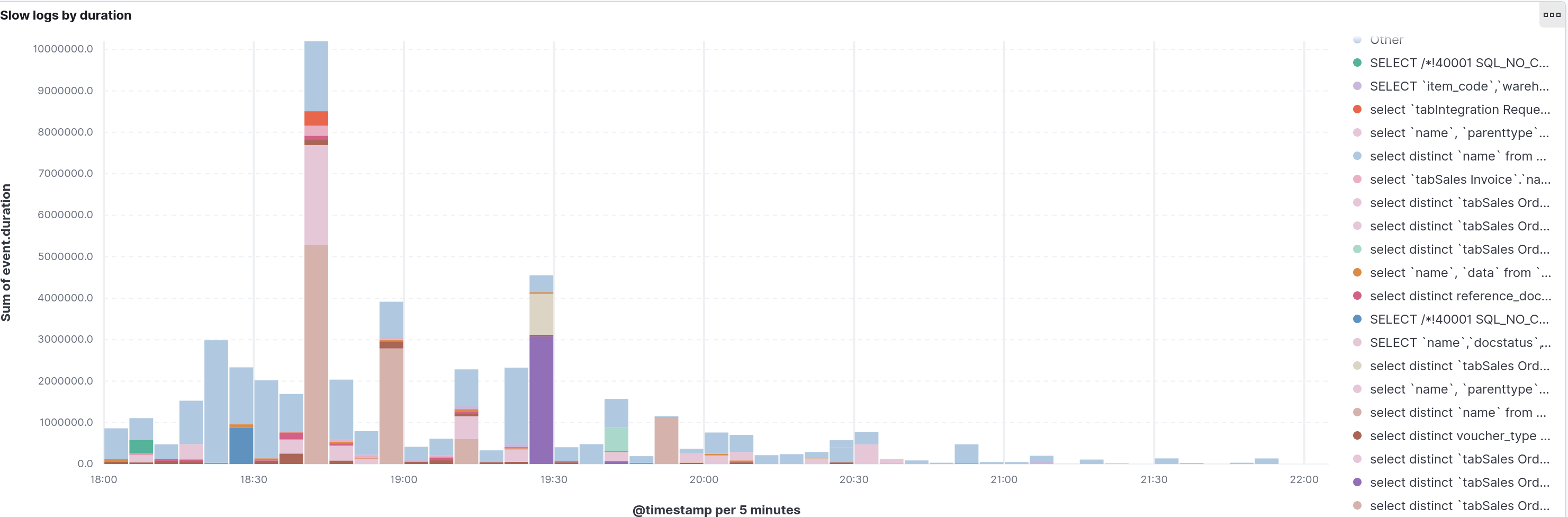 Now that we know there could be queries can be optimised. We need to look at the Slow Queries for the same. We can do this by looking at the DB Server Stats report on log.frappe.cloud