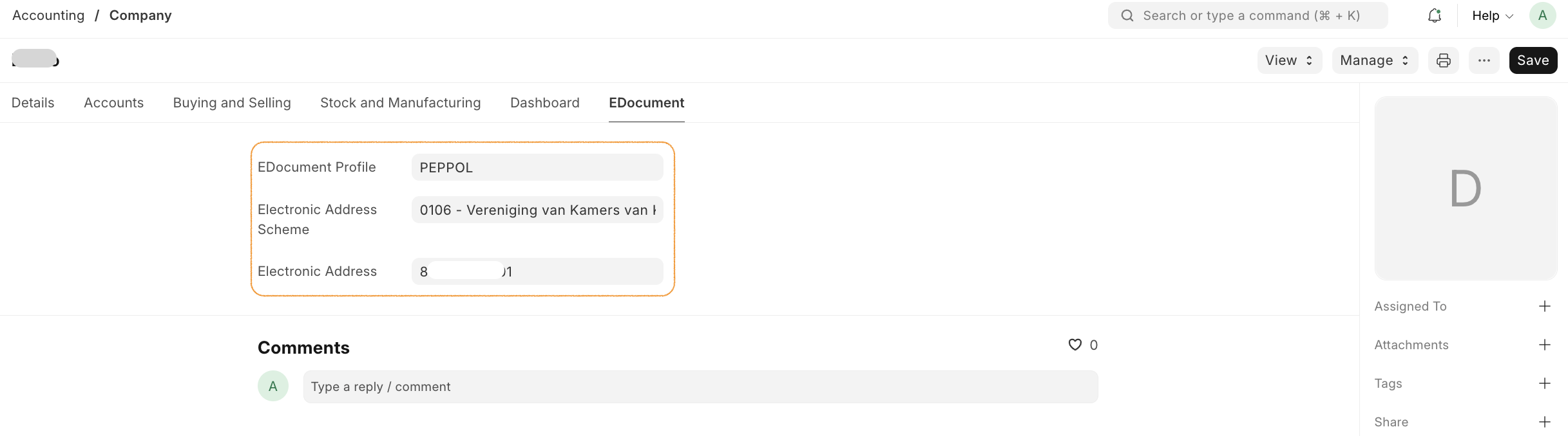 Configure EDocument settings in the Company master data: - EDocument Profile: Default profile to use for this company - Electronic Address Scheme: Scheme for the company's electronic address (e.g., GLN, EAS) - Electronic Address: The company's electronic address identifier