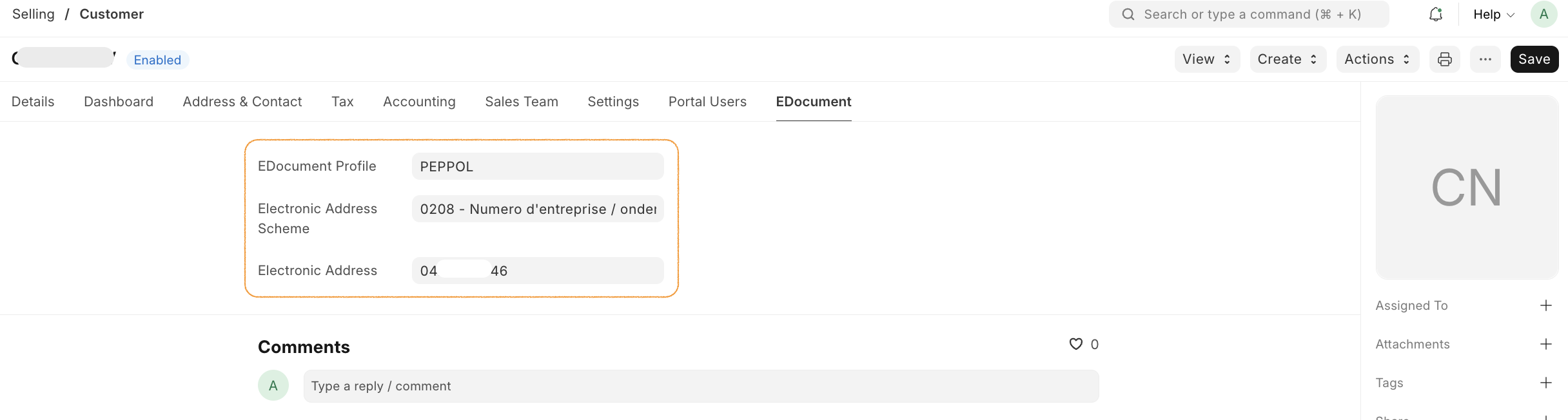Configure EDocument settings in the Customer master data: - EDocument Profile: Default profile to use for this customer - Electronic Address Scheme: Scheme for the customer's electronic address - Electronic Address: The customer's electronic address identifier
