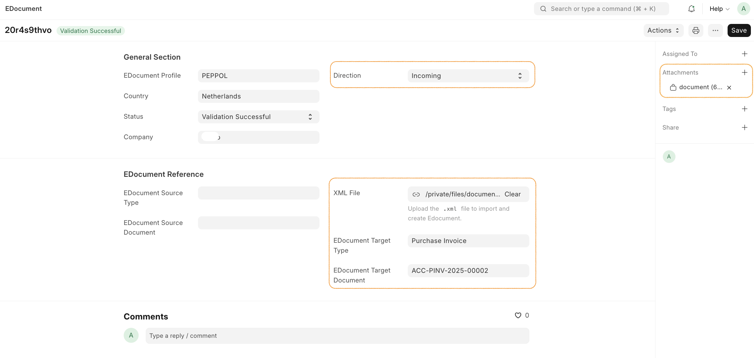 Validation results are displayed in the EDocument record: - Status: Valid/Invalid - Error: Any validation errors - Warnings: Any validation warnings