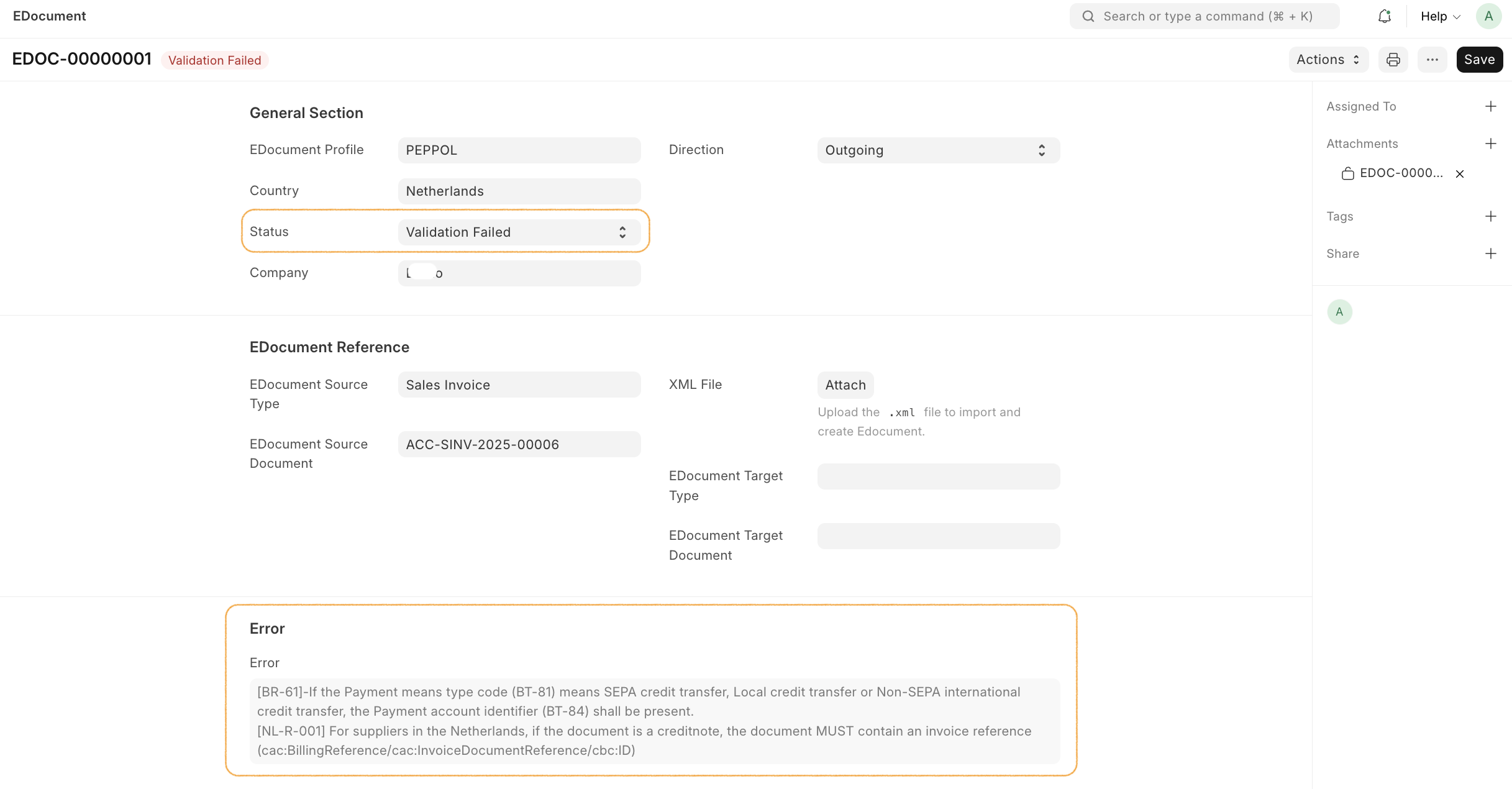 When validation fails, the EDocument record shows: - Status: "Validation Failed" - Error: Detailed validation error messages - Warnings: Any validation warnings (non-blocking)