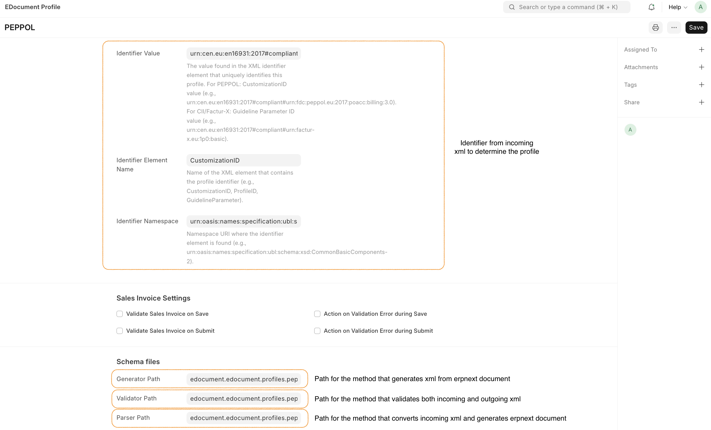 The EDocument Profile defines the configuration for a specific e-document standard (e.g., PEPPOL). It includes: - Identifier Values: Used to detect the profile from XML (namespace, element name, value) - Generator Path: Function that generates XML from ERPNext documents - Parser Path: Function that parses XML into ERPNext documents - Validator Path: Function that validates XML against schemas and business rules - Sales Invoice Settings: Options for automatic validation on save/submit