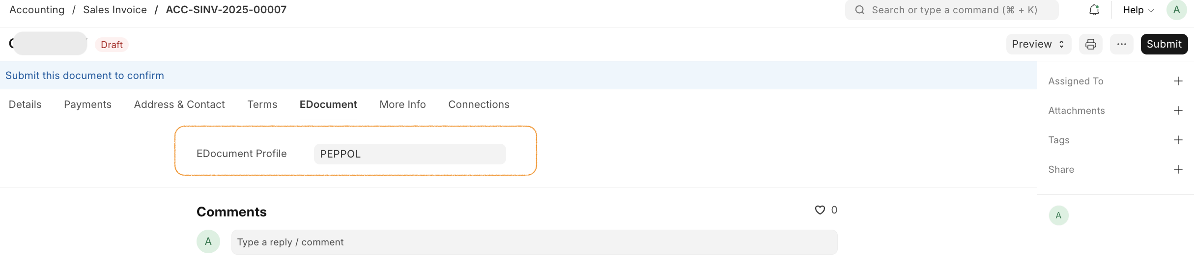 In the Sales Invoice, you can: - Select an EDocument Profile (defaults from Customer if set) - When the invoice is submitted, an EDocument record is automatically created (if profile is set) - The EDocument can then be used to generate and validate the PEPPOL XML