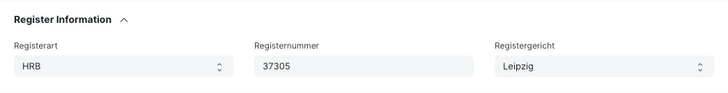 Section for Register Information (Registerart, -gericht und nummer) in Company, Customer and Supplier