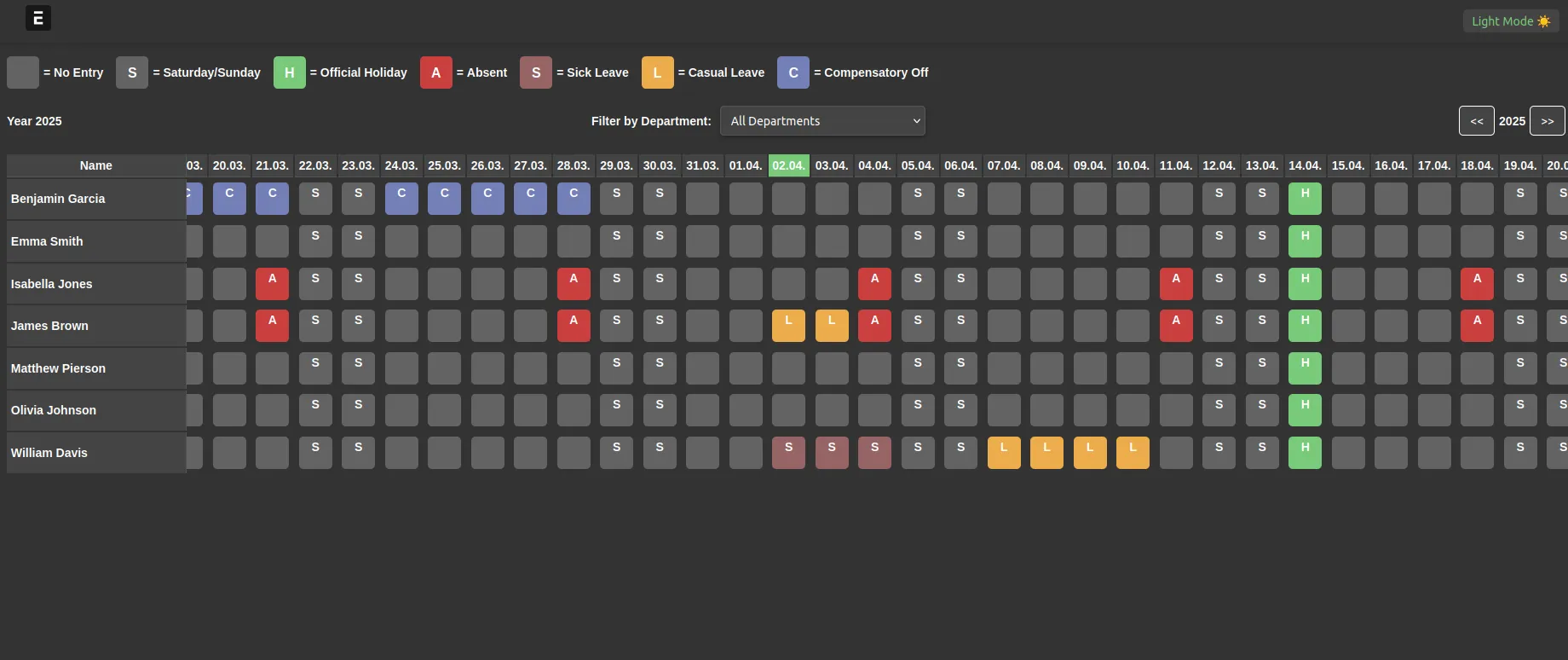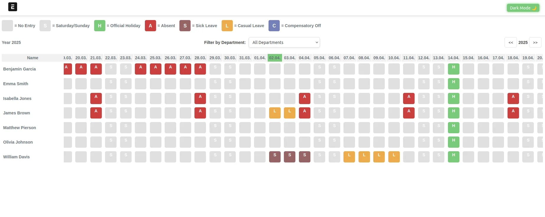 The Leave Calendar is available in both Dark Mode and Light Mode, depending on the theme set in ERPNext..