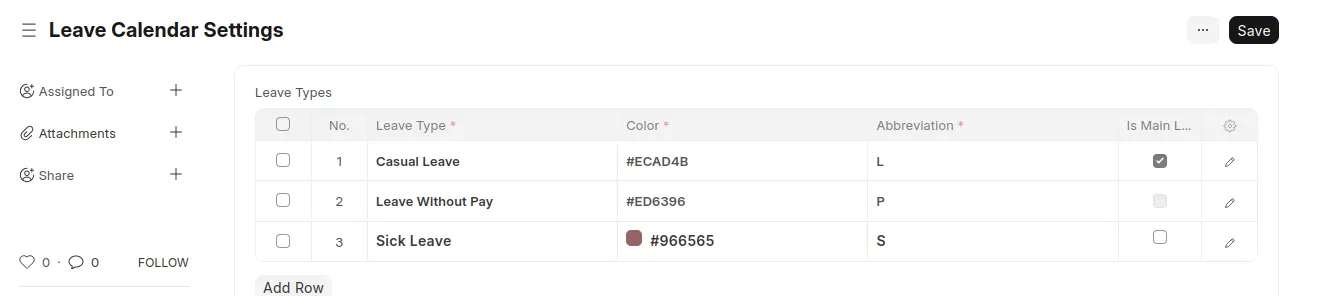 The list of Leave Types to be displayed in the calendar. Any leave type not listed will appear as "Absent".