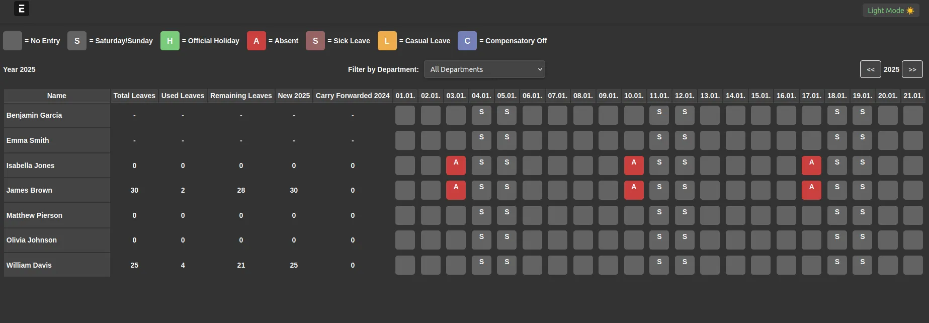 Leave Approvers: Can view leave records of employees they are assigned to approve, as well as their own leaves. Additionally, they can view leave records of employees assigned to a department where they are designated as a Leave Approver.