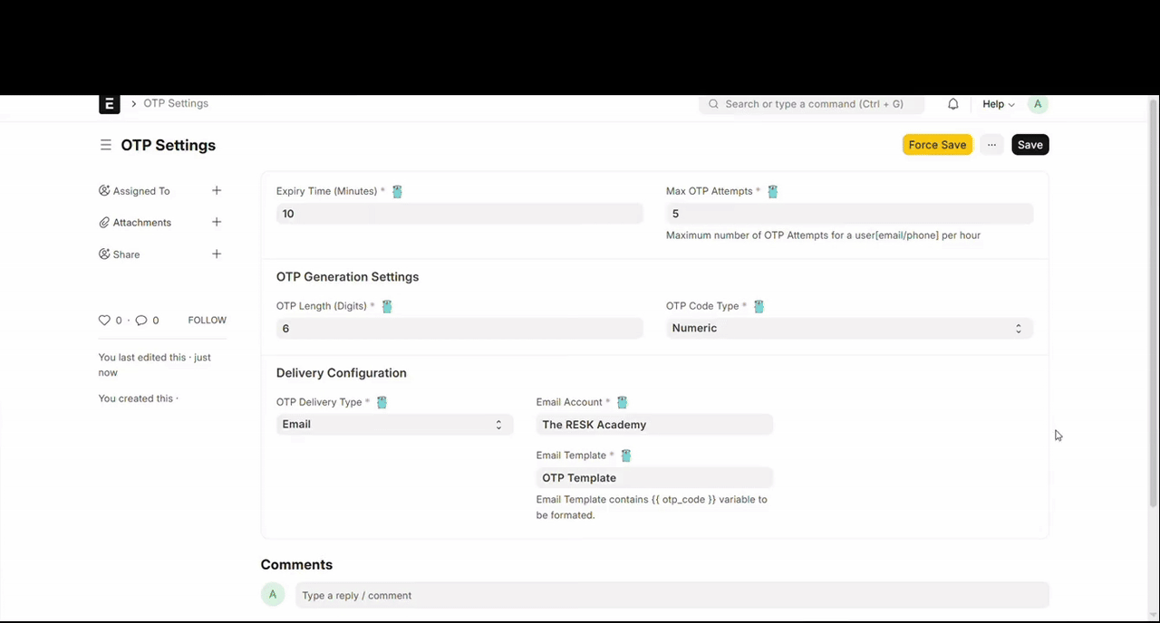 For Email Delivery: - Email Account: Select an active outgoing email account - Email Template: Select an Email Template (must include {{ otp_code }} variable)