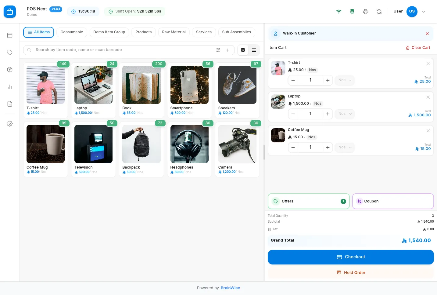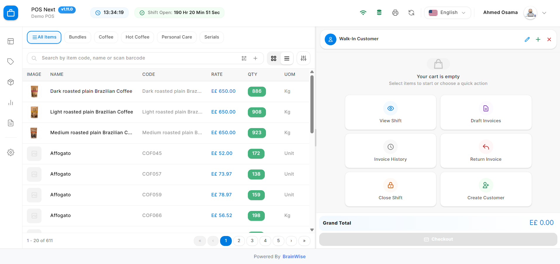 POSNext is a fast and reliable Point of Sale System built by BrainWise for modern retail operations in the MENA region. It helps cashiers sell faster and enables store owners to stay in control — with accurate stock, smooth checkout, and real-time visibility across branches.