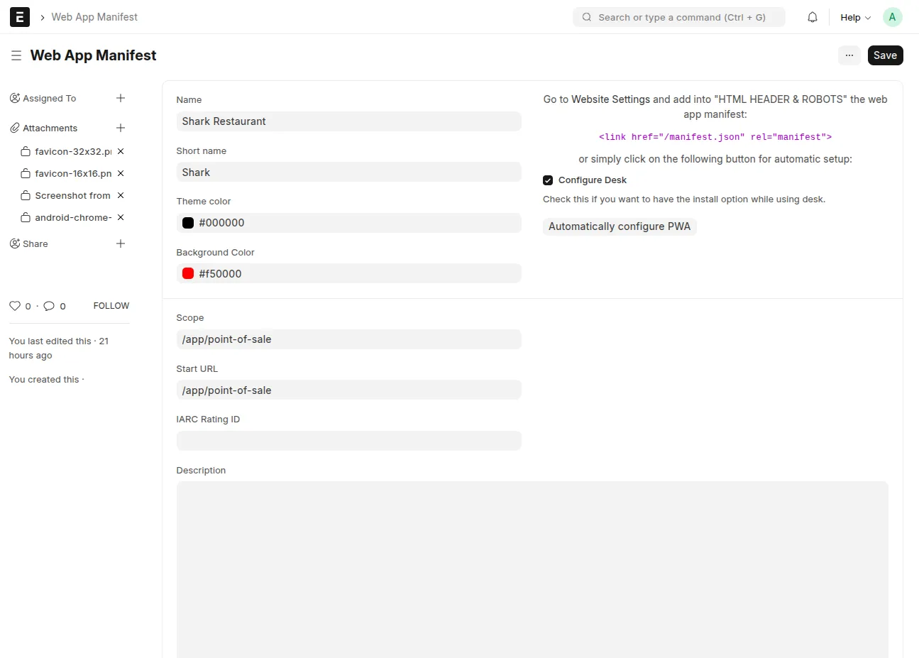 Click "Automatically configure PWA" to: - ✅ Add manifest link to Website Settings - ✅ Enable PWA features automatically - ✅ Optionally enable Desk Mode support