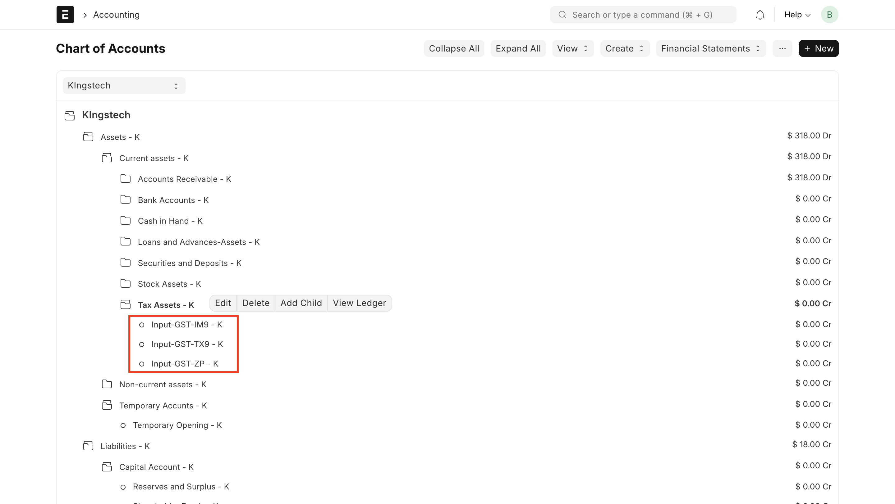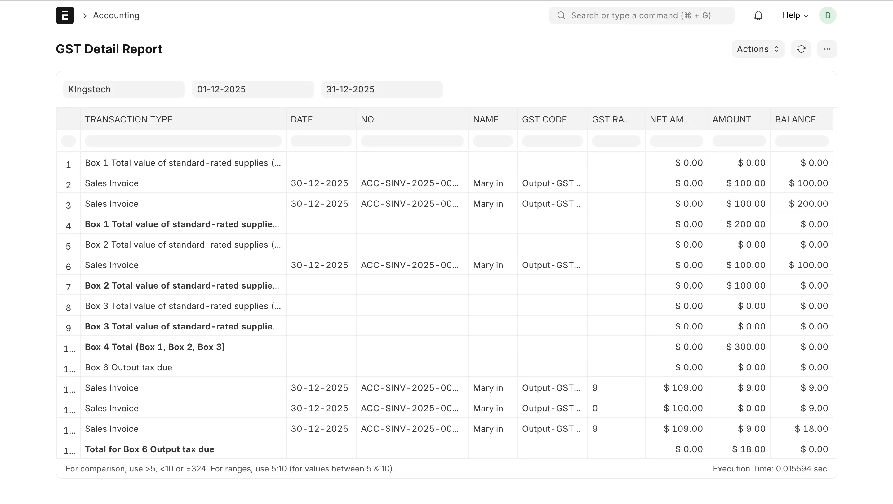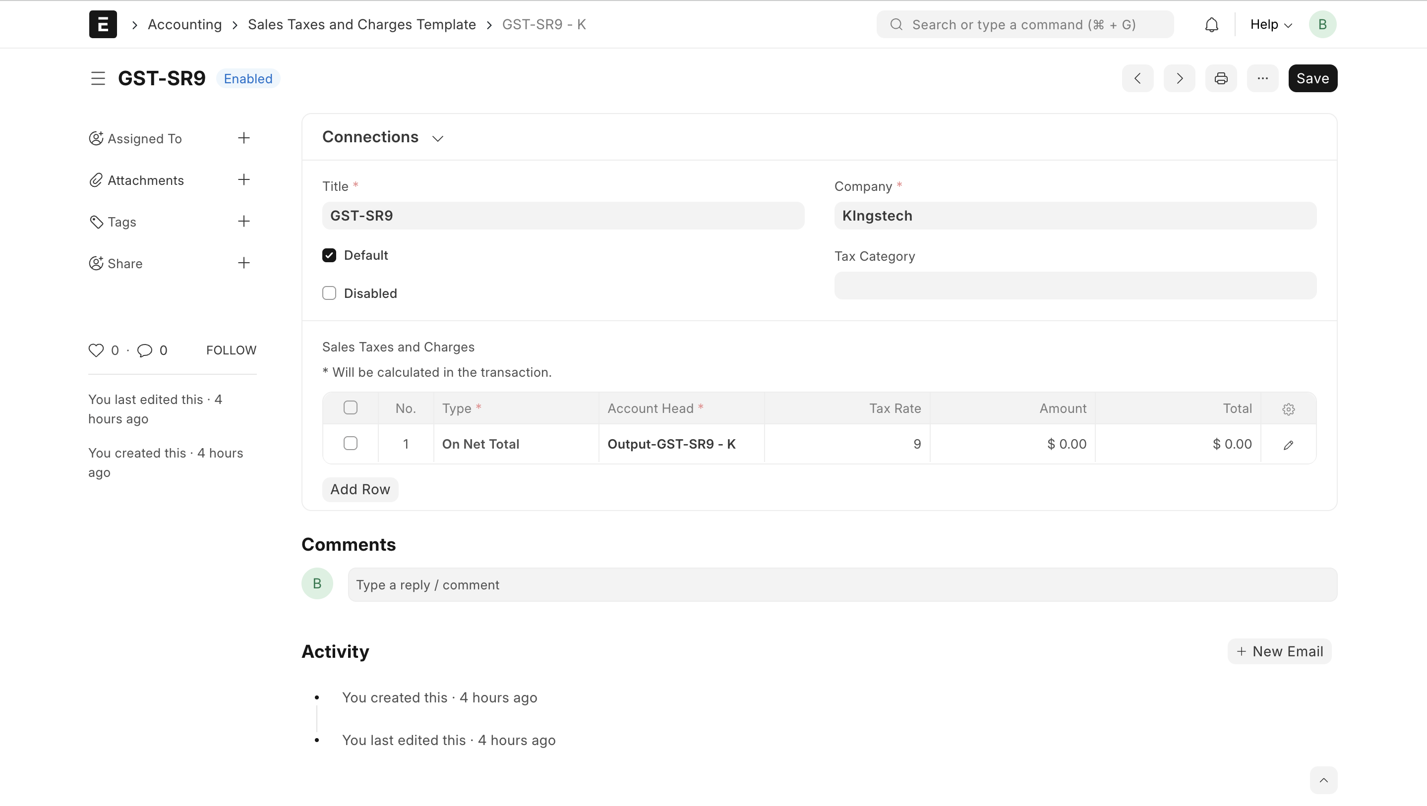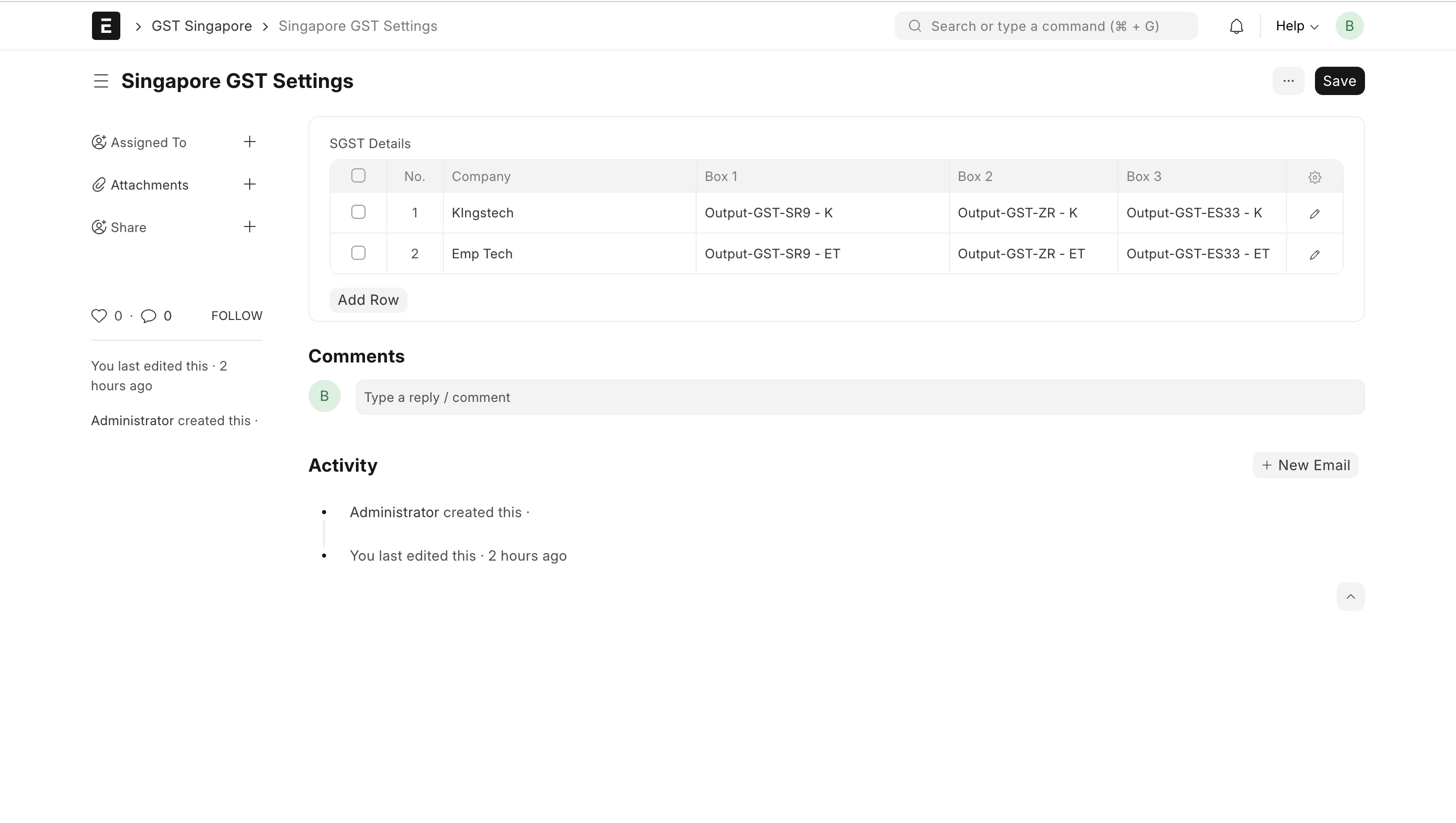 App creates 'Sales Taxes and Charges Template' like 'GST-SR9', 'GST-ZR', and 'GST-ES33' as required by Singapore GST.