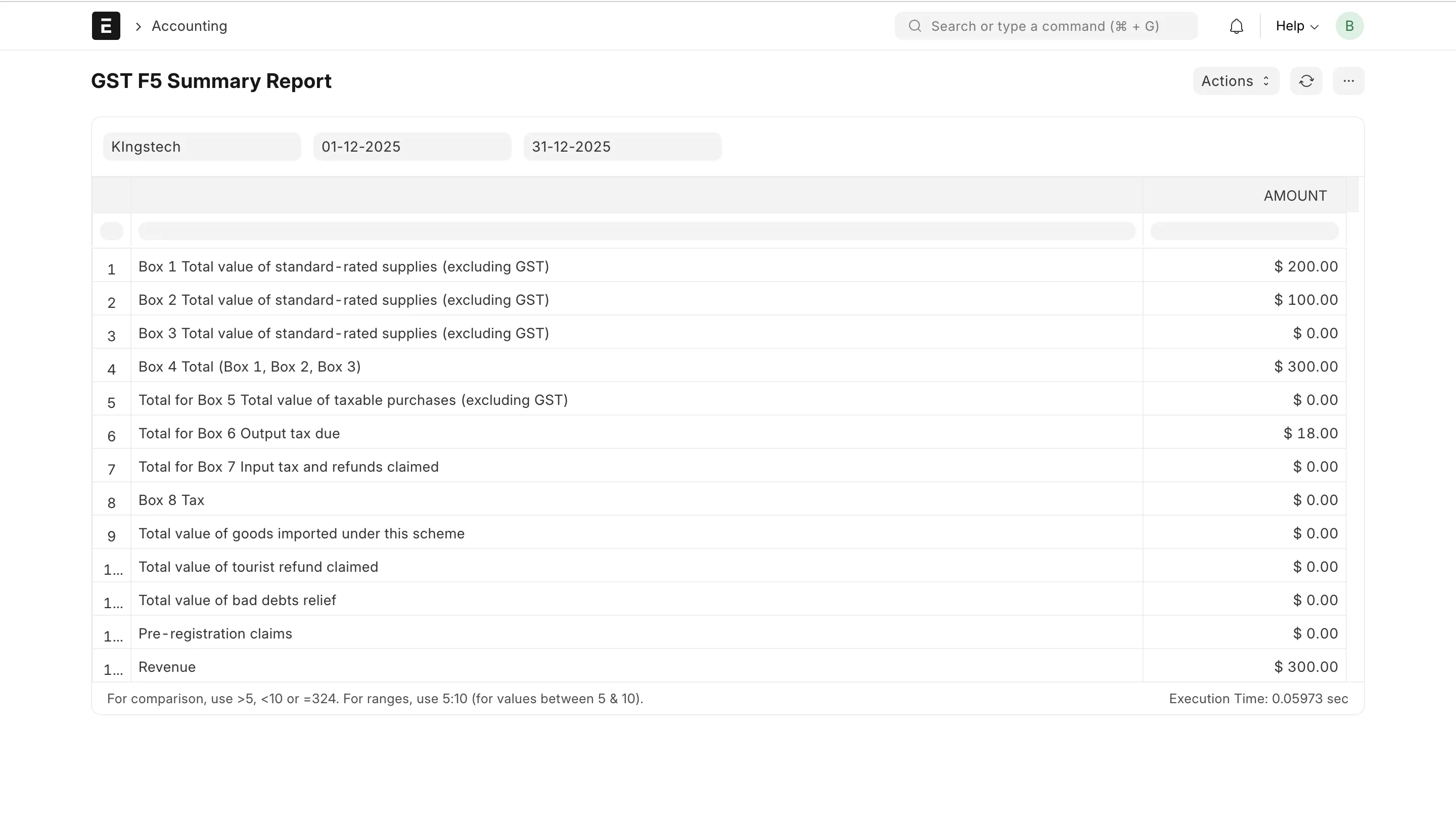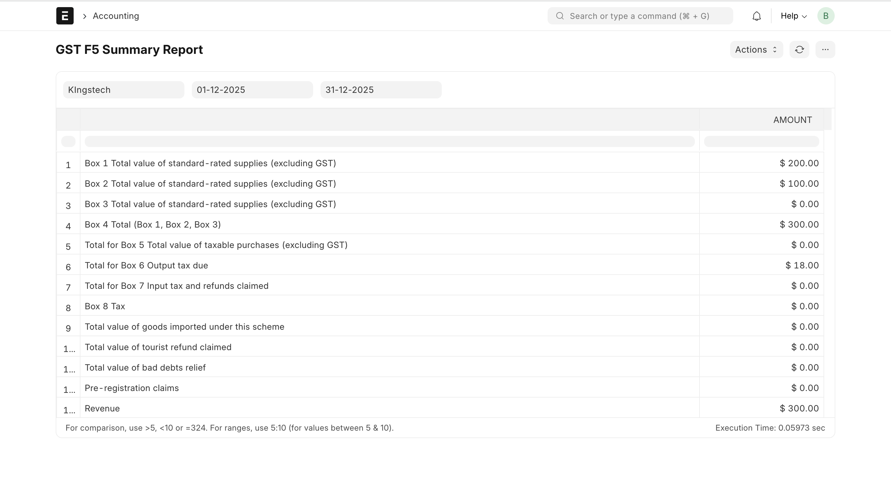 App ships with reports like 'GST F5 Summary Report' and 'GST Detail Report'.