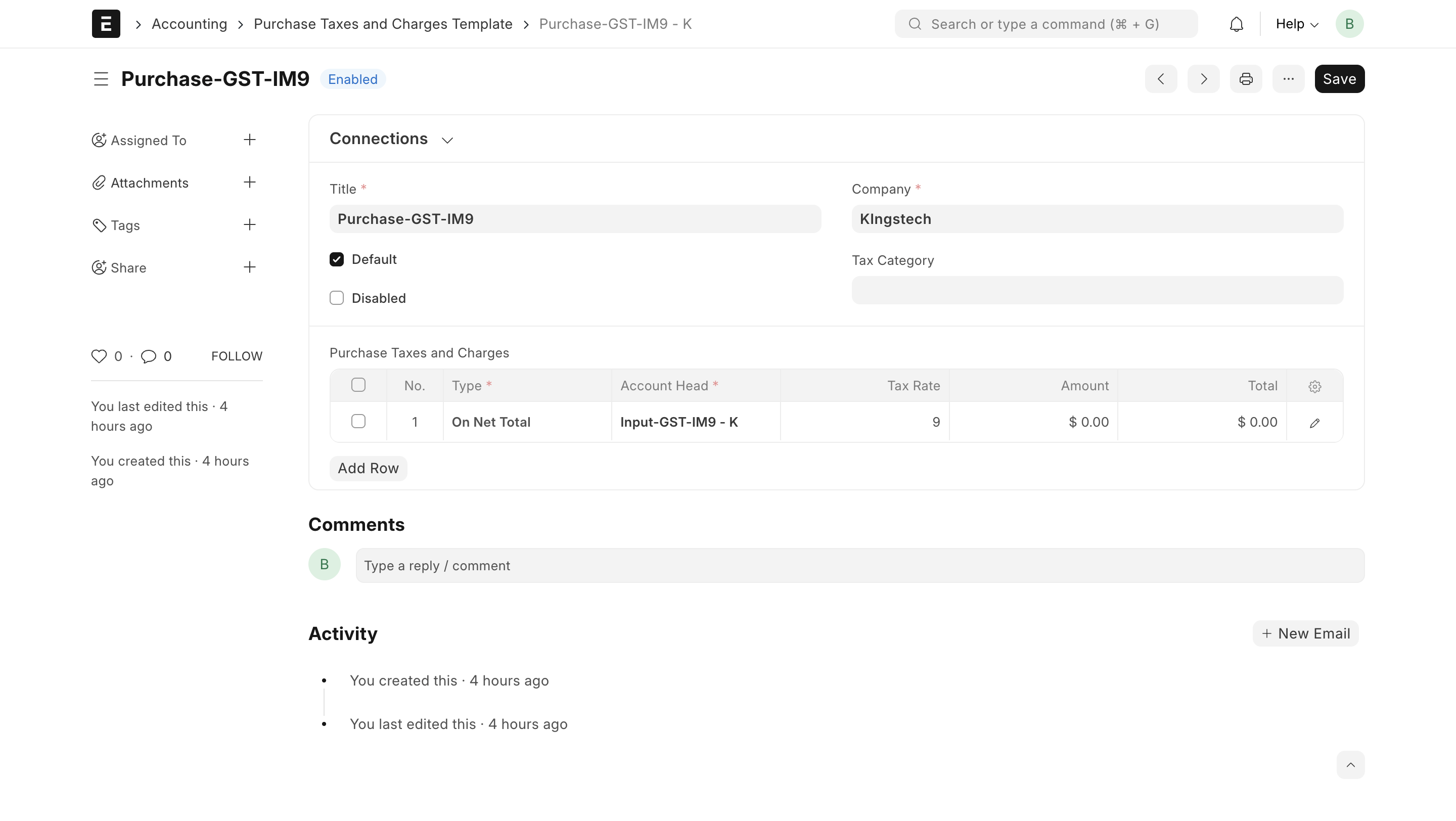 App creates 'Purchase Taxes and Charges Template' like 'GST-IM9', 'GST-ZP', and 'GST-TX9' as required by Singapore GST.
