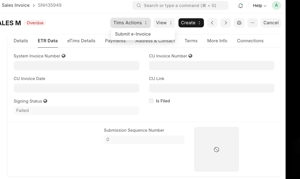 Use the ETIMs Action button labeled "Submit E-Invoice" to manually resend the invoice if needed.