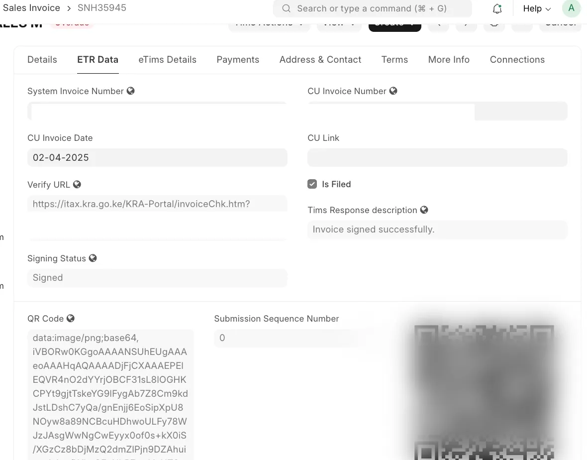 Invoice Update: ERPNext updates the invoice with CU Invoice Number, marks it as filed, and stores the verification URL for generating a QR code.