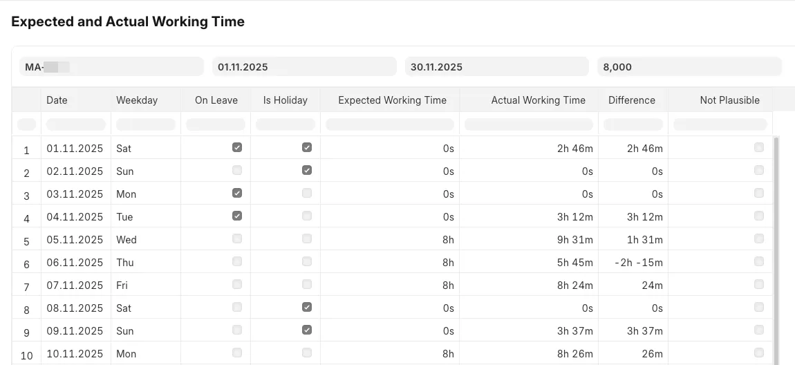 Report of actual vs. expected working time per Employee